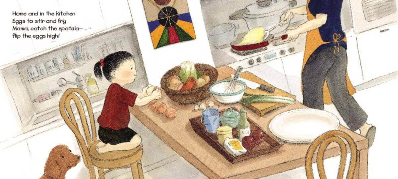 Bee-bim Bop! written by Linda Sue Park and illustrated by Ho Baek Lee is a joyful, rhyming picture book with a bouncy beat that celebrates the warmth of maternal bonding and the delight of shared meals. Told through the eyes of an eager child helping her mother prepare the beloved Korean dish bee-bim bop (mix-mix rice!), the story captures the excitement of shopping, chopping, setting the table, and finally sitting down to eat together.